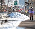 A woman carries a sign reading "ICE Out!" outside the Bishop Henry Whipple Federal Building on Feb. 12, 2026 in Minneapolis, Minnesota. (Stephen Maturen/Getty Images)