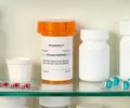 inside a medicine cabinet with a prescription vial and other medications