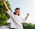 young woman smiling while wearing headphones