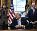 U.S. President Donald Trump (C) and FIFA president Gianni Infantino (R) listens to U.S. Sec'y of Homeland Security Kristi Noem during a meeting with the White House Task Force on the FIFA World Cup 2026 in the Oval Office of the White House in Washington, D.C. - Nov17, 2025. (Brendan Smialowski/AFP via Getty Images)