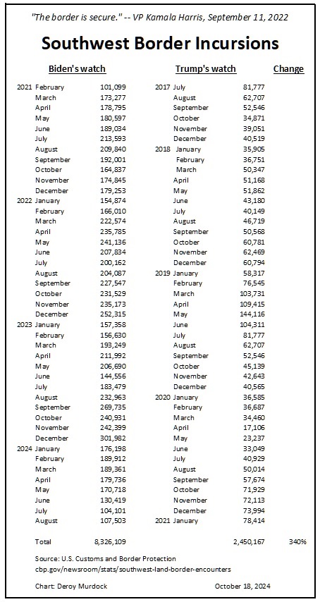 •Since February 2021, the first 42 months of Kamala’s rule saw illegal-alien incursions on the U.S.-Mexico frontier soar from 2,450,167 under Donald J. Trump’s like period to 8,326,109 — up 339.8%.