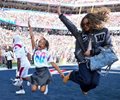 Stars including Travis Scott and Jay-Z were on the sidelines ahead of the game. Jay-Z's daugther, Blue Ivy Carter, leaped in one of the end zones to take a photo.