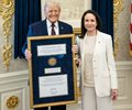 President Donald Trump holds Venezuelan opposition leader Maria Corina Machado's framed Nobel Peace Prize. (DANIEL TOROK/The White House via Getty Images)